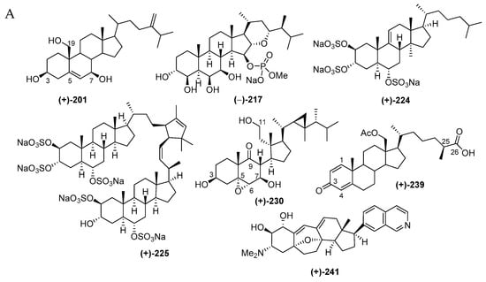 Indonesian marine steroids found in the period of 1970–2017 are comprised of 52 pure molecules and 4 mixtures (Figure 15C) and are shown in Table S5 in Supplementary Materials and Figure 15A, Figure S5. The discovery trend increased in the first 5 years and also in the years after 1990 (Figure 15B). The ratio among new skeletons, rare functional groups, and rare motifs is 1:1:5 (Figure 15D). Four different skeletons are observed in 52 steroids (Figure 15E). Among them, Δ5-sterols constitute the majority (18 molecules). Sulfated steroids were reported as 203, 206 and 224226, while a phosphated steroid was observed in 217. From 1970–2017, Indonesian marine sulfated steroids have contributed 3.3% of the total marine sulfated steroids worldwide, while Indonesian marine phosphated steroids are expected to contribute 20% of total marine phosphated steroids. The ACs of three steroids, 201, 204 and 241, were disclosed by X-ray analysis, while that of 241 was determined by ECD spectrum. For two molecules, 224 and 239, their absolute configurations were determined by MTPA esters and PGME methods, respectively. With regard to the biological sources, the steroids were mainly obtained from the phyla Cnidaria (29 molecules) and Porifera (23 molecules), as listed in Figure 15F. In regard to biological activities, 10 molecules showed significant cytotoxicity, while 11 molecules were cytostastic (Figure 15G). The molecules were isolated mainly from specimens from NSW (14 molecules) and ENT (11 molecules) (Figure 15H).