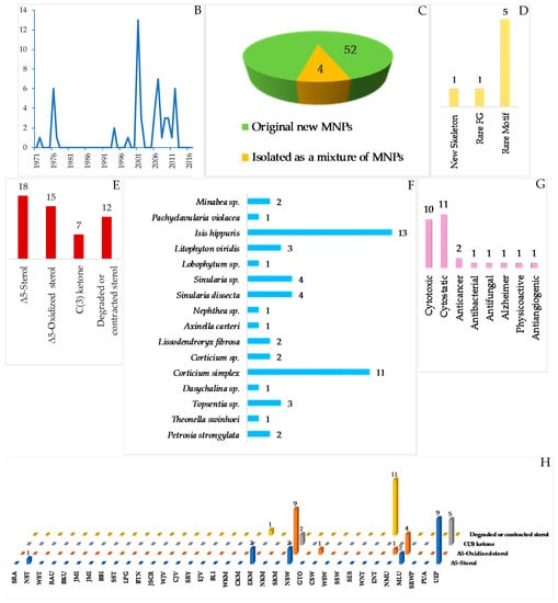 Figure 15. Structures of marine steroids from Indonesian waters found in 1970–2017: (A) representative. Distribution of new marine steroids by year (B). Statistics of new marine steroids (C). Distribution of new marine steroids on the basis of their skeletons (D,E), biological sources (F), significant biological activity (G), and biogeography (H).