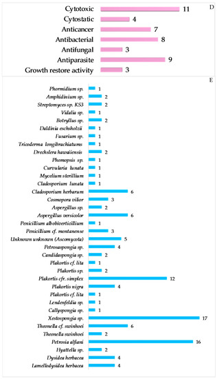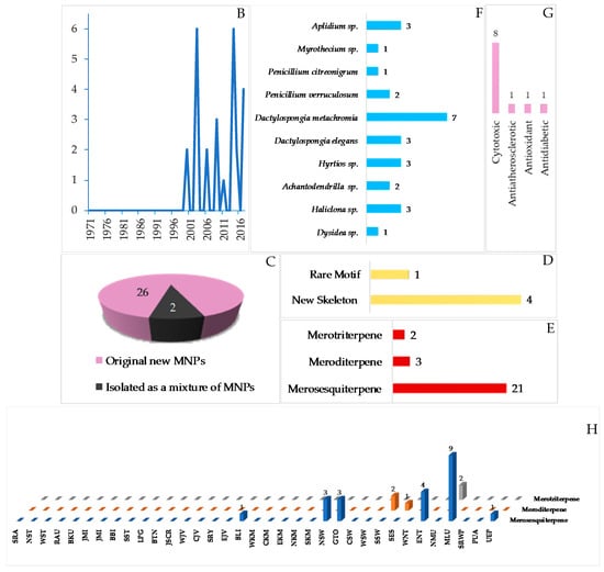 Figure 17. Structures of marine meroterpenoids from Indonesian waters found in 1970–2017: (A) representative. Distribution of new marine meroterpenoids by year (B). Statistics of new marine meroterpenoids (C). Distribution of new marine meroterpenoids on the basis of their skeletons (D,E), biological sources (F), significant biological activity (G), and biogeography (H).