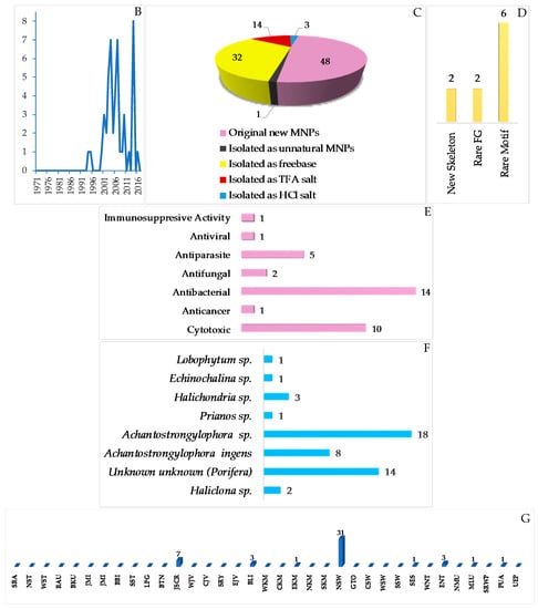 Figure 18. Structures of marine piperidine alkaloids from Indonesian waters found in 1970–2017: (A) representative. Distribution of new marine piperidines by year (B). Statistics of new marine piperidines (C). Distribution of new marine piperidine molecules on the basis of their skeletons (D), significant biological activity (E), biological sources (F), and biogeography (G).