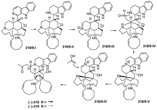 Figure 19. Plausible biosynthetic pathway of (–)-manadomanzamines A 318, B 319.