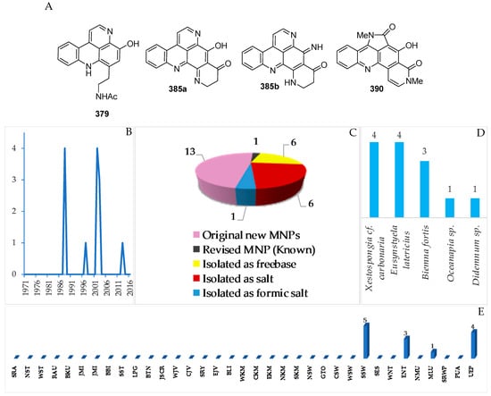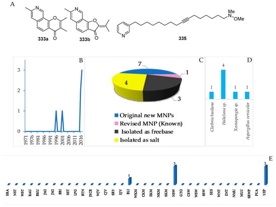 Figure 20. Structures of marine pyridine alkaloids from Indonesian waters found in 1970–2017: (A) representative. Distribution of new alkaloids by year (B). Statistics of new marine pyridine molecules (C). Distribution of new marine pyridine molecules on the basis of biological sources (D), and biogeography (E).