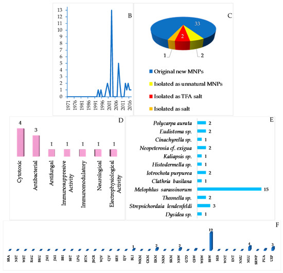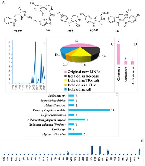 Figure 21. Structures of marine indole alkaloids from Indonesian waters found in 1970–2017: (A) representative. Distribution of new marine indole alkaloids by year (B). Statistics of new marine indole alkaloids (C). Distribution of new marine indole alkaloids, biological activity (D), biological sources (E), and biogeography (F).
