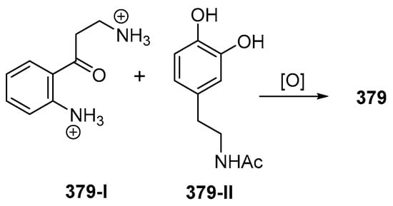 Figure 23. Biomimetic synthesis of styelsamine B (379) from kynuramine (379-I) and N-acetyl dopamine (379-II).
