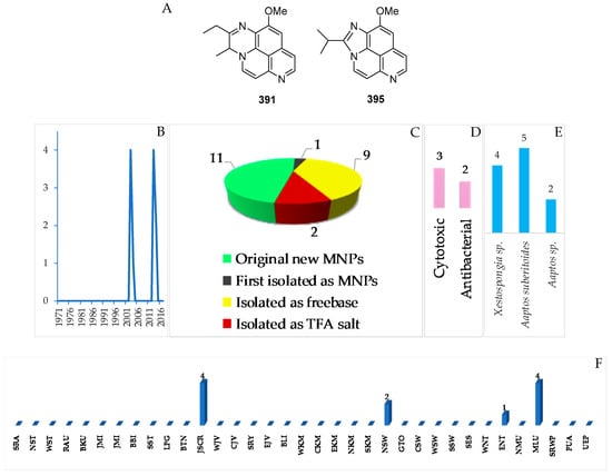 Figure 32. Structures of other marine alkaloids from Indonesian waters found in 1970–2017: (A) representative. Distribution of other marine alkaloids by year (B). Statistics of other marine alkaloids (C). Distribution of other marine alkaloids on the basis of biological activity (D), biological source (E), and biogeography (F).