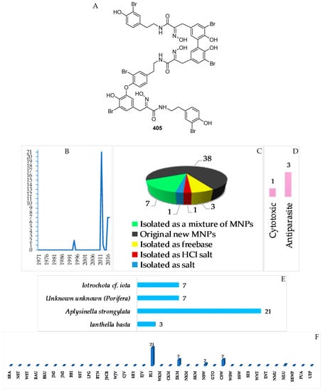 Figure 24. Structures of marine quinoline or isoquinoline alkaloids from Indonesian waters found in 1970–2017: (A) representative. Distribution of the alkaloids by year (B). Statistics of new marine quinoline or isoquinoline alkaloids (C). Distribution of new marine quinoline and isoquinoline alkaloids on the basis of their biological activity (D), biological sources (E), and biogeography (F).