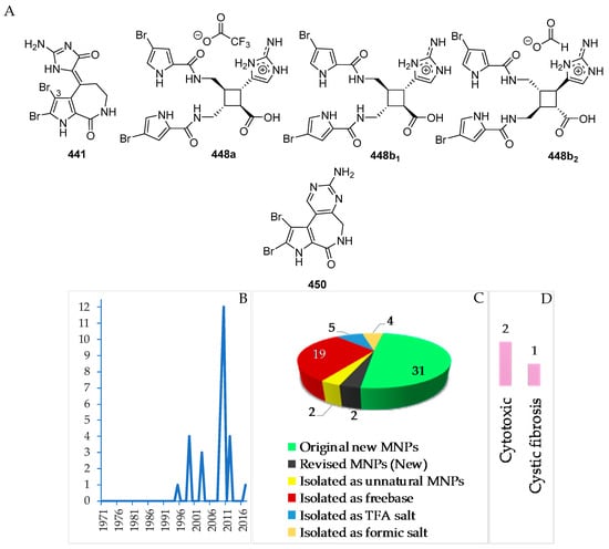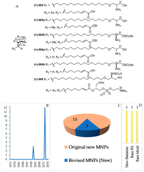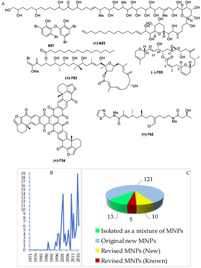 To provide a current status of Indonesian MNPs, we performed a literature review of new chemical structures found in Indonesian waters, including their chemistry, biological activities, spatio-temporal dimensions, taxonomy, and dissemination of information from marine macro- and microorganisms published during the period January 1970–December 2017. An estimated 15,500 new MNPs were discovered worldwide between 1970 and 2010 [29], among which about 486 new molecules (3.1%) were found in Indonesia. In the period 1990–2009, the number of new MNPs worldwide was 9812 [30], while that from Indonesian waters was 406 (4.1%). The present work covered a total of 732 original MNPs, with 4 known to be synthetic compounds, 34 revised, and 9 unnatural MNPs, from January 1970 to December 2017 (Figure 3A). In addition, 43 MNPs were isolated as mixtures, while 130 MNPs were reported with incomplete stereochemistry. Of 732 MNPs, none of them has been approved or is under clinical trial.