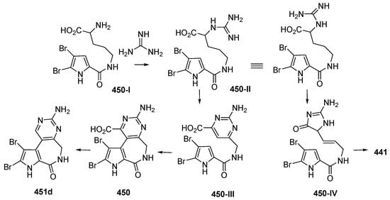 Figure 27. The plausible biosynthetic pathway of latonduines A 450, B 451d, and (Z)-3-bromohymenialdisine 441.