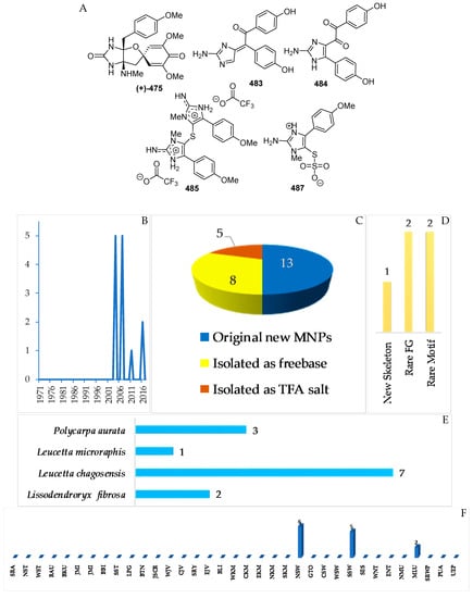 Figure 28. Structures of marine imidazole alkaloids from Indonesian waters found in 1970–2017: (A) representative. Distribution of the alkaloids by year (B). Statistics of imidazole alkaloids (C). Distribution of new marine imidazole alkaloids on the basis of their chemical skeletons (D), biological sources (E), and biogeography (F).
