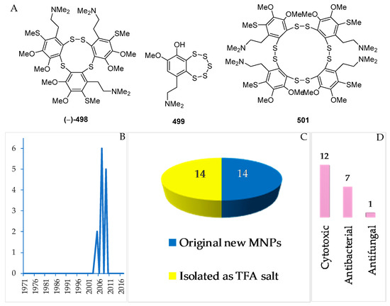 Figure 30. Structures of marine polysulfur aromatic alkaloids from Indonesian waters found in 1970–2017: (A) representative. Distribution of the alkaloids by year (B). Statistics of polysulfur aromatic alkaloids (C). Distribution of new marine polysulfur aromatic-containing alkaloids on the basis of their biological activity (D).