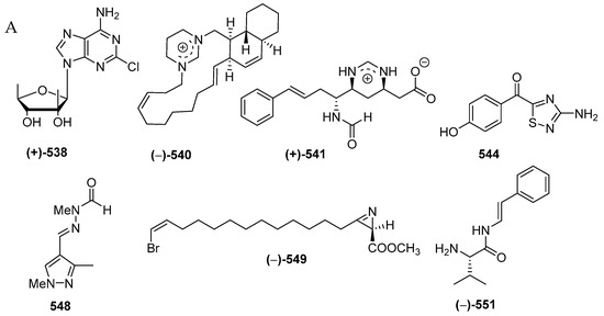 To date, eight marine-derived natural products [7,8,9,10] have been recorded as approved drugs, of which seven molecules have been used to date. (–)-Ecteinascidin 743 (Yondelis®) was derived directly from the Caribbean ascidian Ecteinascidia turbinata (the true producer was recently established as γ-proteobacterial endosymbiont Candidatus endoecteinascidia frumentensis [11]). The molecule is used for treatment of advanced soft tissue sarcoma and for treatment of recurrent platinum-sensitive ovarian cancer when combined with liposomal doxorubicin. The peptide ω-conotoxin MVIIa (Prialt®) from the venom of the cone snail Conus magus is used for analgesic treatment. The anticancer agent (–)-eribulin mesylate (Halaven®) is a synthetic truncated derivative of the polyketide halichondrin B, a super-carbon chain compound isolated from the Japanese sponge Halichondria okadai. The last approved anticancer drug related to MNPs is the antibody−drug conjugate (ADC) brentuximab vedotin (Adcetris®). It consists of a tumor-specific antibody and the pentapeptide auristatin E, a derivative of dolastatin 10 derived from the Indian sea hare Dolabella auricularia. The molecule is used for the treatment of primary cutaneous anaplastic large cell lymphoma (pcALCL) or CD30-expressing mycosis fungoides (MF) in those who have received prior systemic therapy. In addition, the ADC is used to treat untreated stage III or IV classical Hodgkin lymphoma (cHL) in combination with chemotherapy. A mixture of two ethyl esters of fish-derived ω-3 polyunsaturated fatty acids, docosahexaenoic acid (DHA) and eicosapentanaenoic acid (EPA) was approved under the trade name Lovaza® and is used for reducing serum triglycerides. Iota-carrageenan (Carragelose®), isolated from red algae Eucheuma/ Cnondrus, works as an anti-viral barrier in the nasal cavity. Two nucleosides, the anticancer agent (+)-cytarabine (Cytosar®) and the antiviral drug against herpes simplex virus (–)-vidarabine (Vira-A®) are derivatives of spongothymidine and spongouridine from the Caribbean sponge Tethya crypta, respectively. (–)-Vidarabine (Vira-A®) has been discontinued in the US and in Europe.