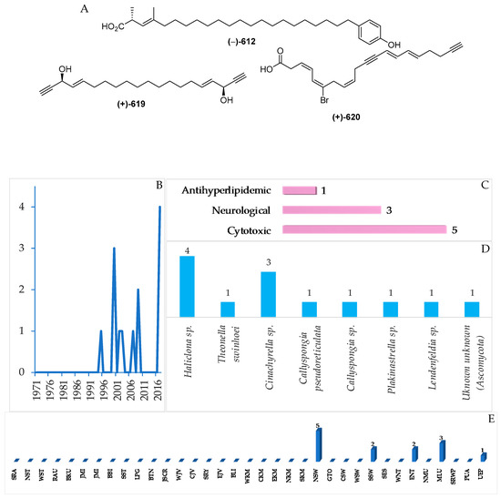 Figure 35. Structures of fatty acids and linear molecules from Indonesian waters found in 1970–2017: (A) representative. Distribution of this group of metabolites by year (B). Distribution of marine fatty acid on the basis of their biological activity (C), biological source (D), and biogeography (E).