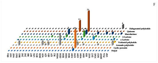 Figure 36. Structures of marine polyketides from Indonesian waters found in 1970–2017: (A) representative. Distribution of marine polyketides by year (B). Statistics of marine polyketides (C). Distribution of marine polyketide on the basis of their biological activity (D), biological source (E), and biogeography (F).
