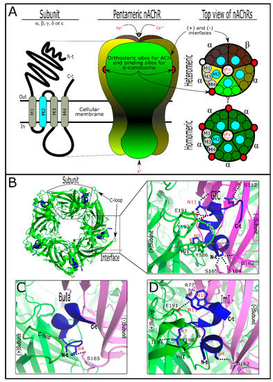 Nicotinic acetylcholine receptors (nAChRs) (Figure 1A) are pentameric structures (five subunits surrounding one central filter that allows the flow of Na+, K+, and Ca++ ions) in which each subunit is composed of four transmembranal segments [45]. There are different subunit types such as α, β, γ, δ, and ε, which can form homomeric (identical subunits) or heteromeric (combination of subunits) nAChRs [46]. These ligand-gated ion channels, expressed in both the nervous system and non-neuronal cells, have a varied number of ligand sites for acetylcholine (ACh) depending on the nAChR subtype [47]. In the nervous system, nAChRs are involved in physiological functions such as analgesia, learning, memory, arousal, and motor control [45], while in the non-neuronal cells, nAChRs promote cell proliferation, secretion, migration, survival, and apoptosis functions [48]. When nAChRs from the nervous system are affected, they generate neuronal disorders such as cognitive disorder, depression, anxiety [11], epilepsy, pain, and diseases, including Parkinson’s and Alzheimer’s [47]. As seen, nAChRs have been demonstrated to be involved in multiple physiological processes, depending on the nAChR-specific subtype responsible for each activity [49]. Curiously, α-conotoxins have shown target nAChR subtypes [30,34]. They are antagonist competitors from acetylcholine binding sites [50]. As a result, α-conotoxins have become an important research tool to analyze interaction with nAChRs [51].