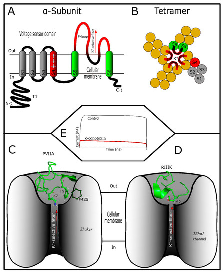 Potassium channels and κ-conotoxin interactions. (A) Basic structure of the α-subunit from VGKCs showing segment S4 with positive charges and pore region structured by segments S5 and S6. In this P-loop (highlighted in red) κ-conotoxins interact. Here, accessory subunits are omitted. (B) VGKC organization by four α-subunits showing ion pore (P-loops). (C) κ-conotoxin PVIIA (PDB: 1AV3) interacting with related Shaker channels. In the dyad model, two amino acids (Lys and Phe) are important for toxin interaction. Lys is inserted in the selective filter of potassium channel. (D) RIIIK and related Shaker channel interaction. In this interaction 4-hydroxiproline residue at the 15th position of RIIIK is responsible for the K+-flow block. (E) Typical electrophysiologic record of K+-currents before (black) and after (red) adding the toxin. It can be observed that K+-currents decrease after toxin application caused by ion pore obstruction. Here K+-current types are not considered. VGKC structures were designed as described by the authors in the text.