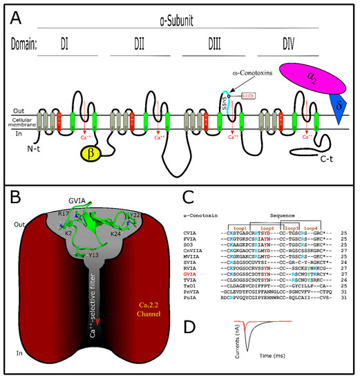 Voltage-gated calcium channels and ω-conotoxin interactions. (A) Basic structure of the α-subunit of VGCCs. This is constituted by four domains, which compose the Na+ pore. Each domain shows segment S4 with positive charges and pore region structured by S5 and S6 segments. Here is showed only one known interaction point by ω-conotoxins. Accessory subunits such as β or α2δ are showed. (B) ω-Conotoxin GVIA (PDB: 2CCO) interacting with Cav2.2 channel. Specific interaction points among them are unknown. (C) ω-Conotoxins alignment showing cysteine connectivity and loops. Key amino acids for interaction with their targets are highlighted. * C-terminal amidated, O hydroxyproline. (D) Typical electrophysiologic record of Ca++ currents before (black) and after (red) adding the toxin. It can be observed that Ca++ currents decrease after toxin application. Here Ca++ current types are not considered. VGCC structures were designed as described by the authors in the text.