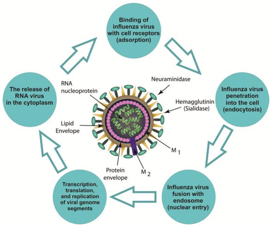 Influenza virions are particles with a diameter of 80–100 nm, coated with a lipid membrane with an integrated surface of three types of glycoproteins: hemagglutinin (HA), neuraminidase (NA), and the viral ion channel (M2) [13]. On one side, this membrane is in contact with the cytoplasmic domains of HA and NA, and on another, with the core of the virion. The ribonucleoprotein (RNP) is represented by eight segments of the genome: single-stranded negative-polarity RNA in a complex with the nucleoprotein protein and three subunits of the polymerase complex [14,15]. After the virus enters the cell, the ribonucleoprotein gets to the nucleus, where transcription, translation, and replication of segments of the viral genome occur (Figure 1).