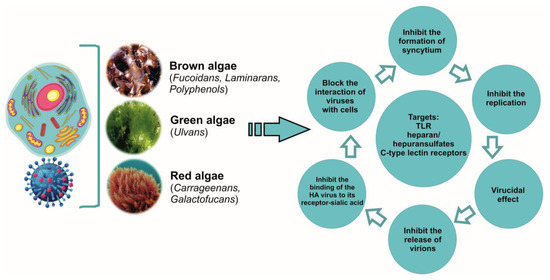 Last decade, there have been many works devoted to the antiviral potencies of sulphated polysaccharides. The formation of pathogen resistance to drugs on the pharmaceutical market requires new approaches to the treatment of viral diseases, including influenza. To do this, it is necessary to have drugs with different mechanisms of action, which in addition to antiviral effects, have anti-inflammatory, antioxidant, and immunomodulatory activity and to which viruses form resistance only on rare occasions. As presented in this review, the sulphated polysaccharides of brown, red, and green algae have such properties in relation to influenza infection (Figure 2).