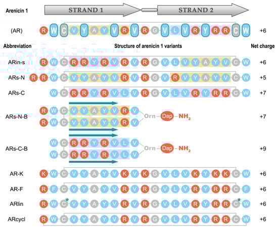 - Panteleev, P.V.; Bolosov, I.A.; Ovchinnikova, T.V. Bioengineering and functional characterization of arenicin shortened analogs with enhanced antibacterial activity and cell selectivity. J. Pept. Sci. 2016, 22, 82–91. [Google Scholar] [CrossRef] [PubMed]