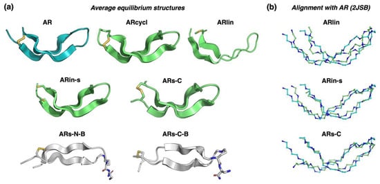 The ARs-N-B and ARs-C-B variants, instead, failed to fold from an initial extended linear conformation, in the timescales used for our simulations. Therefore, we used a manually constructed β-sheet structure with a disulfide bond to perform simulated annealing experiments. These resulted in the formation of relatively flat β-sheet structures, which were further equilibrated by an additional MD simulation. The resulting average structures obtained for all modelled peptides are shown in Figure 2a, in which it can be clearly seen that the β-hairpin structures of ARin-s and ARs-C show the same characteristic kink as AR, while the parallel β-hairpin of ARs-N-B and ARs-C-B are flatter and less twisted.
