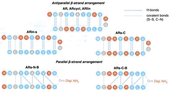 Pseudosymmetric sequence of the arenicin-1 molecule and structure of its designed analogues. The hydrophobic residues are marked in blue, the polar residues are in red, and the palindromic arrangement of the WCxxYxxVxVxxVxVxYxxCW motif in the initial arenicin-1 sequence is indicated with rounded boxes. The VYYAYV(R) and (L)VRYRR motifs present in strands 1 and 2 of arenecin-1 are, respectively, highlighted by yellow and blue-grey boxes and were swapped (ARin-s), placed symmetrically with inversion (ARs-N and -C), or branched from a central residue (ARsin-N-B and ARs-C-B) in variants designed to test the role of the residue symmetry. Asterisks (*) in the linear version of arenicin-1 (ARlin) mark the sites of Cys alkylation with iodoacetamide. Green arrows accentuate the parallel arrangement of the strands in ARs-N-B and ARs-C-B peptides, obtained by linking the “branches” of the hairpin to the α and δ amines of an ornithine residue (Orn), in turn coupled to an amidated diaminopropionic acid (Dap) group at the C-terminus (Figure 7).