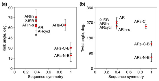 Average kink (a) and twist (b) angles for the peptides as a function of their sequence symmetry. Sequence symmetrization in ARs-N-B and ARs-C-B results in significantly lower kink and twist.