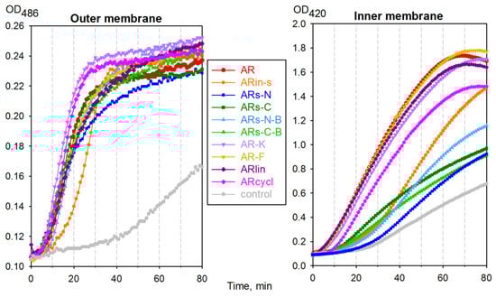 The Escherichia coli ML35p strain expresses a plasmid-encoded periplasmic β-lactamase and is constitutive for cytoplasmic β-galactosidase, while lacking lactose permease [15]. This makes it very useful to monitor the permeabilization of both its outer and inner membranes, using real-time assays. From Figure 5, it can be seen that the outer membrane became fully permeable to nitrocefin, a β-lactamase substrate, ~30 min after adding most arenicin-1 analogs. However, all variants with a modified symmetry demonstrated a decreased ability to permeabilize the inner membrane of E. coli ML35p, suggesting a reduced membranolytic activity.