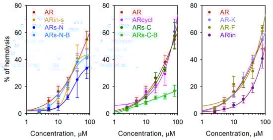 The impact of the peptides on eukaryotic membranes was also analyzed using the hemolysis assay, with peptide concentrations up to 80 µM (Figure 6). None of the modifications completely abolished the relatively high hemolytic activity of wild-type arenicin, although the branched variant based on the C-terminal motif (ARs-C-B), which was moderately active on bacteria, demonstrated a significantly lowered ability to lyse the erythrocytes. On the other hand, other variants with improved antimicrobial activity (e.g., AR-F and AR-K) did not show a significantly increased hemolytic activity, based on the HC50 value.
