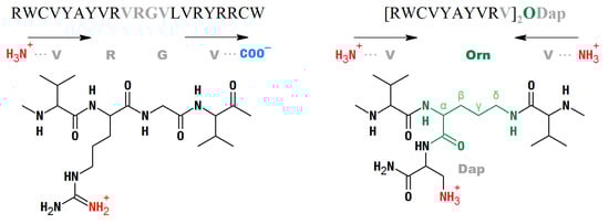 ARin-s was designed to alter the sequence symmetry by inverting the VYAYV and VRYRR motifs, respectively present in the N- and C-terminal strands of wild-type AR (Figure 1). ARs-N had increased symmetry based on only the VYAYVR motif of the N-terminal strand; an additional Arg residue was added to offset the decrease in overall charge that this entails. ARs-C, instead, had increased symmetry based on the VRYRR motif of the C-terminal strand. To increase symmetry even further, two non-proteinogenic variants—ARs-N-B and ARs-C-B—were constructed by branching either the VYAYVRV sequence of strand 1 or the VLVRYRR sequence of strand 2 (fragments 1–10 and 13–21, respectively, Figure 1) from the α and δ amines of an ornithine (Orn) residue. This resulted in a parallel arrangement of the hairpin strands, so that the obtained peptides had two N-termini. The branching Orn residue was linked to an amidated diaminopropionic acid (Dap) residue at the peptide’s C-terminus, in an attempt to maintain a structure of the branching site as far as possible isosteric with the Arg residue normally present in the turn region (see Figure 7 in the Methods section).