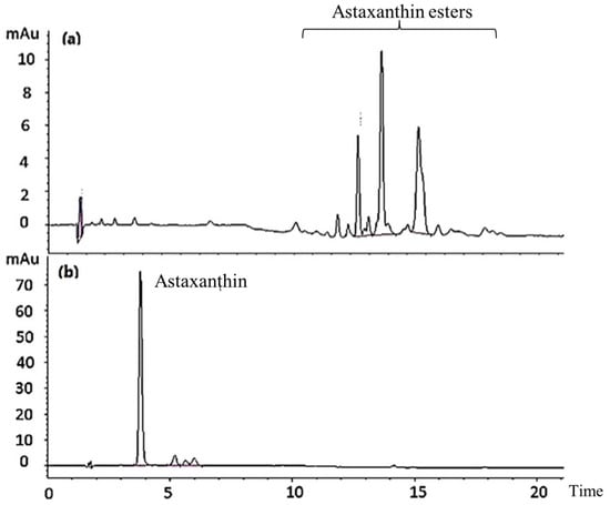 HPLC chromatograms of AXT in shrimp cephalothorax before (a) and after (b) hydrolysis treatment.