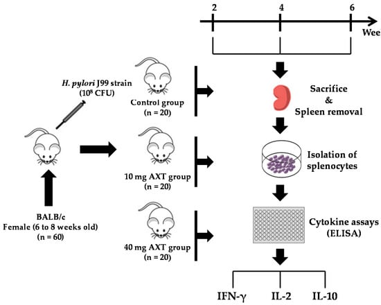 Experimental design to investigate the effects of AXT from shrimp cephalothorax on the cytokine release of splenocytes in H. pylori-infected mice.