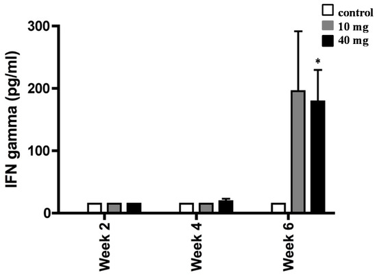 Interferon gamma (IFN-γ) production by splenocytes from H. pylori-infected mice. BALB/c mice were daily treated with 10 or 40 mg of AXT and sacrificed two, four, and six weeks post-inoculation. Splenocytes from infected mice were stimulated with sonicated H. pylori (50 µg mL−1), harvested after 36 h, and used for ELISA. Values are the mean ± SEM of duplicate ELISA determinations. Only values within a detection limit of 15–2000 pg/mL are represented. * p < 0.05 versus 10 mg and control groups.