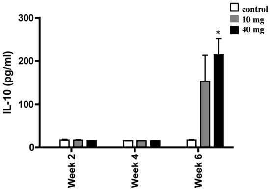Induction of IL-10 release of splenocytes from H. pylori-infected BALB/c mice. Animals orally dosed with 10 and 40 mg of AXT were sacrificed two, four, and six weeks post-inoculation. Splenocytes from infected mice were stimulated with sonicated H. pylori (50 µg mL−1), harvested after 36 h, and used for ELISA. Data are presented as the mean ± SEM. Only values within a detection limit of 15–2000 pg/mL are represented. * p < 0.05 versus 10 mg and control groups.
