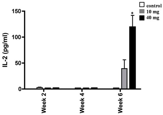 To extend the above findings that AXT played a key role in mediating H. pylori-associated inflammation, we next measured the release amount of IL-2 in splenocytes of H. pylori-inoculated mice supplemented with 10 and 40 mg of AXT (Figure 5). Although no statistical significance was observed, the synthesis of IL-2 was increased in splenocytes of H. pylori-inoculated mice treated with 10 mg of AXT. However, after six weeks, the level of IL-2 was significantly greater (p < 0.05) in animals treated with 40 mg of AXT than that of mice supplemented with 10 mg AXT or untreated animals.