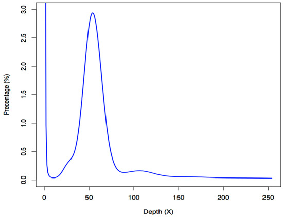 A k-mer analysis of the blue tilapia genome. The x-axis is the sequencing depth of each unique 19-mer, and the y-axis is the percentage of these unique 19-mers. The peak depth (K_depth) is at 54, and the corresponding k-mer number (N) is 55,102,309,616. We therefore calculated the genome size (G) to be ~1.02 Gb based on the following formula: G = N/K_depth [16].