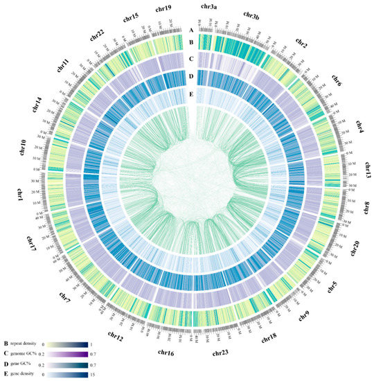 A circos view of the blue tilapia genome. From outside to the inside rings: (A) chromosome length (Mb) and numbers, (B) distribution of repeat density in 100 kb non-overlapping windows, (C) distribution of genome GC content, (D) distribution of gene GC content, and (E) distribution of gene density. Syntenic blocks are connected with green lines, and each line indicates one pair of paralog genes in the blue tilapia genome.