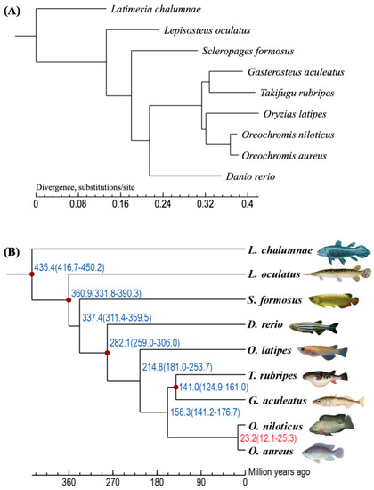 A phylogenetic tree of nine examined fish species. (A) The phylogenetic position of the blue tilapia was determined on the basis of one-to-one orthologues from the nine fish species. (B) The divergence times were predicted with references (red dots) from the TimeTree (http://www.timetree. org/).