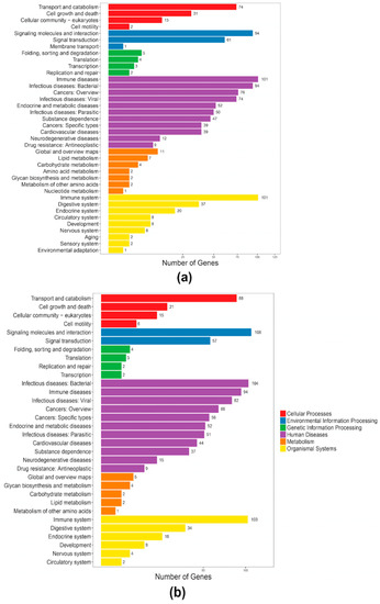 After a KEGG clustering analysis, we predicted that the 407 putative AMP genes in the blue tilapia were enriched to 198 pathways, with representative relations with “immune disease”, “immune system”, and “infectious disease: Viral and signaling molecules and interaction” (Figure 5a). Similarly, the putative AMP genes in the Nile tilapia were clustered into 161 pathways, with the major classes related to immune and diseases (similar to the blue tilapia; Figure 5b).