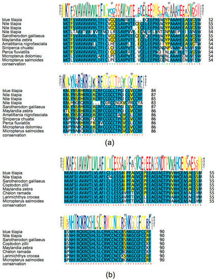 Hepcidin, one of the most important and common AMPs in fishes, also showed remarkable differences between the Nile tilapia and the blue tilapia. There existed 11 hepcidins (query IDs 1701 and 809 in Table S6) in the Nile tilapia, while the blue tilapia only had two hepcidins (query ID 1701). A Swiss-Prot annotation provided a strong evidence that 12 out of the 13 putative AMP genes were predicted to be hepcidin. APD1701, a novel hepcidin from Orange-spotted grouper (Epinephelus coioides), was proven to have antimicrobial activities against Vibrio vulnificus and Staphylococcus aureus [34]. APD809 is a cDNA sequence of hepcidin-like AMPs in Mozambique tilapia (Oreochromis mossambicus), whose synthetic peptide was active against gram-positive bacteria, such as Listeria monocytogenes, Enterococcus faecium and Staphylococcus aureus [35]. To validate the identification of putative hepcidin genes, we preformed multiple sequence alignment. As shown in Figure 6, representative putative and known hepcidin genes exhibited a high similarity. Interestingly, we found that these putative hepcidin genes in both the Nile and the blue tilapias can also be divided into two categories, hepcidin-1 (Figure 6a) and hepcidin-2 (Figure 6b) based on the sequence similarity to those known hepcidin sequences from other fish species.