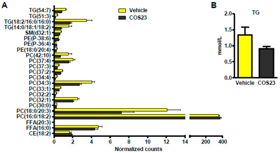 We next performed an un-targeted lipidomic analysis to assess the effect of COS23 on plasma lipids. A total of 143 lipid species were identified in plasma, and 23 of them showed significant differences between the COS23-treated and vehicle group mice (Figure 4A). Most lipids were decreased following COS23 treatment except PE(38:6), PE(36:4), PC(16:0/18:2), and cholesteryl ester (CE)(18:2). The total TG in plasma showed trends towards lower levels (p = 0.1097) in COS-treated mice compared to the vehicle mice (Figure 4B), as detected using a biochemical kit. In terms of alterations of levels of specific TGs, TG(54:7), TG(51:3), TG(18:2/16:0/16:0), and TG(14:0/18:1/18:2) were significantly decreased (p < 0.05) after COS23 treatment as revealed by the lipidome analysis (Figure 4A). Interestingly, 12 species of PCs in plasma were changed with a significant difference (p < 0.05) and most of them were reduced except for PC (16:0/18:2). Overall, our results showed that specific alterations in the plasma lipidome occurred following COS23 treatment, among which TG and PC levels changed the most.