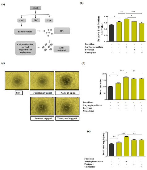 The purpose of this study was to develop the most potent bioactive compound from fucoidan by enzyme-aided extraction and to evaluate it activity in maintenance of endothelial progenitor cells. Fucoidan was hydrolyzed using three different enzymes: AMG, viscozyme, and pectinex. EPCs treated with equivalent concentration of enzyme treated fucoidan (20 µg/mL): AMG, viscozyme, and pectinex, and observed that only the enzyme-aided extraction of fucoidan by AMG (EAEF-AMG) significantly improved cell proliferation in comparison to extraction with viscozyme and pectinex (Figure 1b). To ensure endothelial function, we assessed the tube formation capabilities of EPCs, after treatment with equal concentrations of fucoidan and 20 µg/mL of its enzyme aided extracts: AMG, viscozyme, and pectinex for six hours. EAEF-AMG showed stronger endothelial activities, through increased total tube length and number of branches, than fucoidan and its other enzyme aided extracts viscozyme, and pectinex (Figure 1c–e). Hence, EAEF-AMG was chosen for further evaluation.