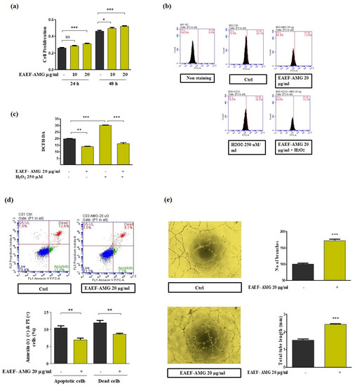 Excessive production of ROS in endothelial cells causes endothelial dysfunction and plays a critical role in the development of CVD [17,18]. To assess whether EAEF-AMG protects the EPCs from the oxidative stress induced cell death, we treated the EPCs with different concentration of EAEF-AMG and measured ROS levels and proliferation rate (Figure 2a; Supplementary Figure S1a,b). Pretreatment of EPCs with EAEF-AMG (20 µg/mL) for 24 h protected the cells from the oxidative stress-induced apoptosis of H2O2 (250 µM). Pretreatment significantly reduced the H2O2 induced reactive oxygen species levels and apoptosis (Figure 2b–d).