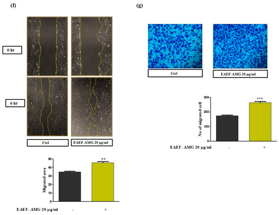 To investigate whether EAEF-AMG increased angiogenic activity, we performed a tube formation assay using GFR reduced Matrigel coated plates. EPCs treated with 20 μg/mL EAEF-AMG or vascular endothelial growth factor (VEGF-20 ng/mL) for 6 h significantly increased total capillary networks and number of branches compared to untreated cells (Figure 2e). Additionally, EAEF-AMG treated cells displayed significantly enhanced tubular networks and branch points, compared to VEGF treated cells, (Supplementary Figure S2a–c). Moreover, 20 µg/mL of EAEF-AMG treatment for 6 h significantly increased the scratch wound healing and Transwell migration (Figure 2f,g). In addition to determining the proangiogenic cytokine expression levels, cells were treated with EAEF-AMG (20 µg/mL) for 6 h along with respective control and the mRNA expression of the proangiogenic cytokines CXCL12 increased and IL-8 were found to be significantly dysregulated in comparison to the untreated cells. (Supplementary Figure S1c).