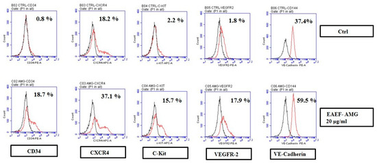 Endothelial surface markers play a vital role in distinguishing and controlling the cellular function and development. Endothelial cell dysfunction influences the expression of functional markers. To discover whether EAEF-AMG treatment improved the functional marker expression, CD34, C-Kit, CXCR4, VEGFR-2, and VE-cadherin were analyzed by FACS. EPCs treated with 20 μg/mL EAEF-AMG for 24 h, substantially increased the expression of functional markers including CD34, C-Kit, CXCR4, VEGFR-2, and VE-cadherin (Figure 3)
