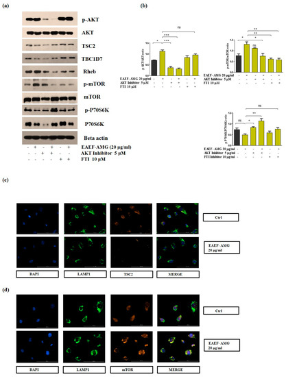 To elucidate the importance of AKT/Rheb signaling in EPCs, Western blotting was performed to analyze the protein expression of AKT and its downstream signaling, including Rheb. Treatment with 20 μg/mL EAEF-AMG for 24 h up-regulated the expression of p-AKT, p-mTOR, and Rheb, subsequently TSC2 and TBDC17, negative regulators of mTOR signaling were down-regulated (Figure 4a,b). We observed that treatment of 20 μg/mL EAEF-AMG for 45 min hindered lysosomal localization of TSC2, a negative regulator of mTOR signaling in comparison to the control (Figure 4c). Additionally, 20 μg/mL EAEF-AMG promoted mTOR/LAMP1 aggregation on perinuclear sites in comparison to the control cells (Figure 4d).