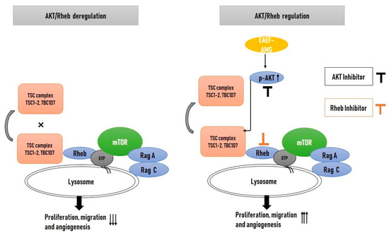 AKT is a serine/threonine protein kinase with three isoforms. Phosphorylation of AKT inactivates the downstream signaling of TSC complexes through dissociation of TSC2/LAMP1 colocalization in perinuclear sites [12]. We found phosphorylation and activation of AKT (Ser473) by EAEF-AMG increased cell proliferation by hindering the protein level expression of TSC, TBDC17 (Figure 4a and Figure 5a). TSC2/LAMP1 colocalization suppressed the activation of GTPase activating protein of Rheb [12,13], a direct activator of mTOR. We found EAEF-AMG treatment blocked the colocalization of TSC2/LAMP1 (Figure 4c) and regulated downstream protein expression, cell proliferation, wound healing, migration, and capillary formations in an AKT- and Rheb-dependent manner (Figure 6). Inhibition of AKT and Rheb (farnesyltransferase inhibitor) negatively regulates protein expression, cell proliferation, wound healing, migration, and capillary formations (Figure 4 and Figure 5).