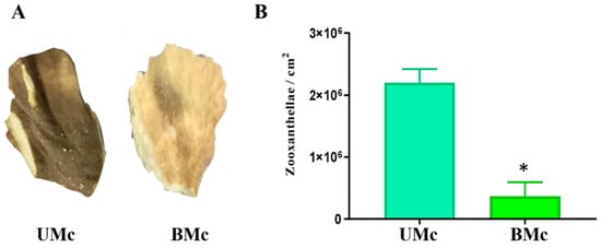 (A) Photographs of representative fragments of unbleached (UMc) and bleached (BMc) M. complanata collected in 2016 in the Mexican Caribbean. (B) Symbiont density quantified (n = 3) and expressed per cm2 for UMc and BMc. Data are mean ± SEM. (*) Indicate significant difference (p < 0.05) in symbiont density between UMc and BMc. Photographs from UMc and BMc specimens were taken by Víctor Hugo Hernández-Elizárraga and Norma Olguín-Lopez.