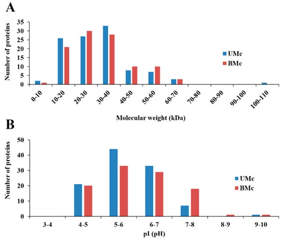 Isolectric point (pI) and molecular weight distribution of proteins found in the soluble proteomes from unbleached (UMc) (n = 3) and bleached (n = 3) specimens (BMc) of M. complanata. (A) Distribution graph of molecular weights. (B) Distribution graph of isoelectric points.