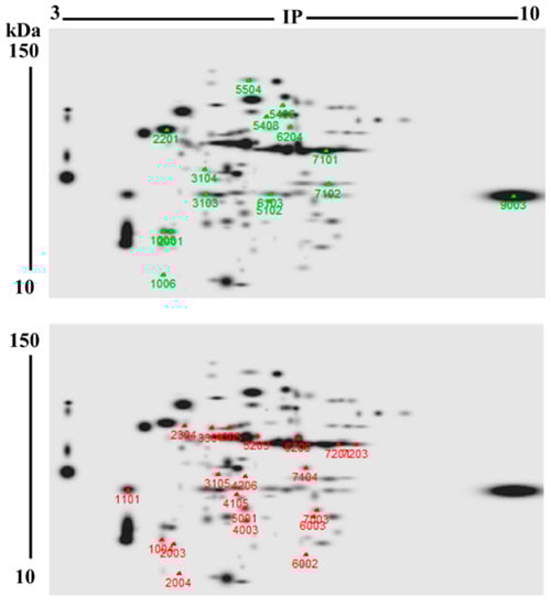 DE-PAGE analysis evidenced that proteomes from unbleached (103 protein spots) and bleached (95 proteins spots) hydrocorals showed different protein profiles. Most of the proteins had isoelectric points (pI) and molecular weight values ranging from 4–8 and 10–40 kDa, respectively (Figure 3). 71 protein spots matched in both soluble proteomes, while 35 were differentially expressed (fold change > 2) in bleached specimens, fifteen of these proteins were up-regulated, while twenty were down-regulated (Figure 4).