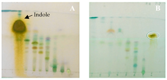 In order to compare the effect of different culture media on the production of metabolites of V. neocaledonius, we carried out a qualitative thin layer chromatography (TLC) study to analyze the ethyl acetate extract from the strains cultured in 2216E and Lysogeny broth L.B medium (liquid). From Figure 1, the difference of the chemical pattern between fractionation A (extract obtained from medium 2216E) and fractionation B (extract obtained from LB medium) can be observed. The major compound (indole) appeared in fractionation A and it was used as a chemical marker in fractionation B, whereas we did not observe it in the plate corresponding to the second extract (Figure 1B). The plates were revealed with p-anisaldehyde and different colors were observed that correspond mainly to phenolic compounds, terpenes, flavonoids, flavanones. The anisaldehyde with sulfuric acid allowed us to visualize, among other compounds, terpenoids, polypropanoids, saponins and phenolic compounds. In the violet and red colors, terpenoids can be observed, flavonoids in yellow, and phenolic compounds in the brown color (Figure 1A,B).